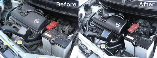 エンジンルーム汚れ清掃・仕上げ艶出し新車時の艶が蘇ります。最後に艶出しをしてこの様にかなり綺麗になります