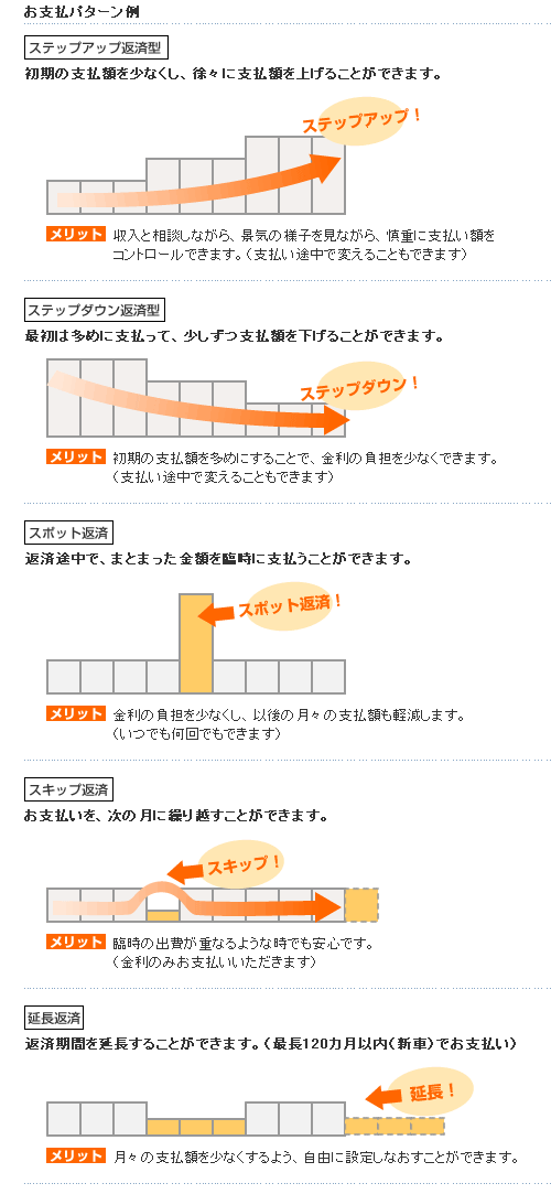 月々のお支払い金額も、お支払回数も、お客さまが自由に決められる新しいオートローンです。「お金に余裕ができた」「突然の出費が重なった」「予定していたほどボーナスが出なかった」等々、ライフスタイルや経済状況は変化し、予測がしにくいものです。